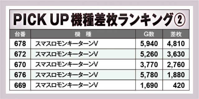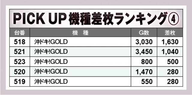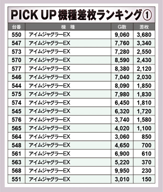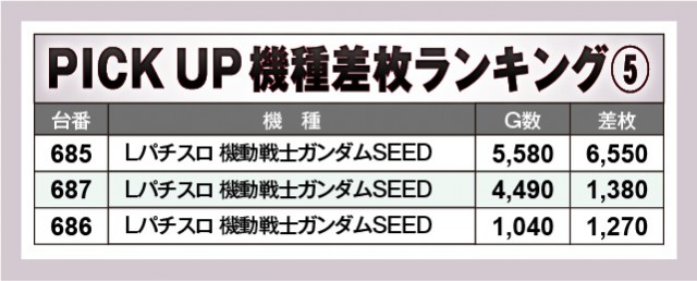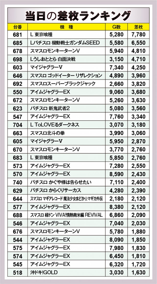 『L 東京喰種』から7,000枚OVERを確認でき、そして『Lパチスロ 機動戦士ガンダムSEED』でも6,000枚OVERが発生している。他にもまとまった出玉を確保していることから、ファンは打ちごたえのある状況に嬉々としていたかもしれない。また『ジャグラー』シリーズが多く名を連ねている点も見逃せず、いずれも回転数と差枚数が比例する展開を披露していたのが鮮烈だ。