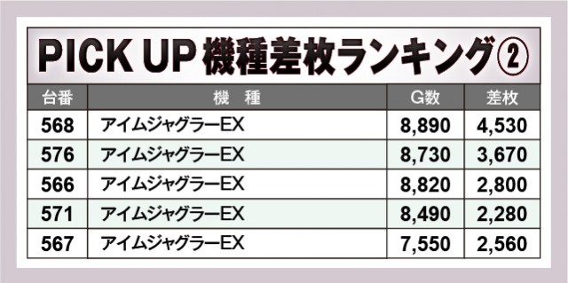 当日は『スマスロモンキーターンV』にて8,000枚OVERが飛び出し、さらに5,000枚OVERも2台輩出している。また『L麻雀物語』も6,000枚OVERとこちらも気を吐いており、各所で熱気が噴出していたのが鮮烈だ。そして『アイムジャグラーEX』と『マイジャグラーⅤ』も回転数と差枚数が比例する展開を披露し、プラス台を多く生み出していたのも見逃せないポイントだ。