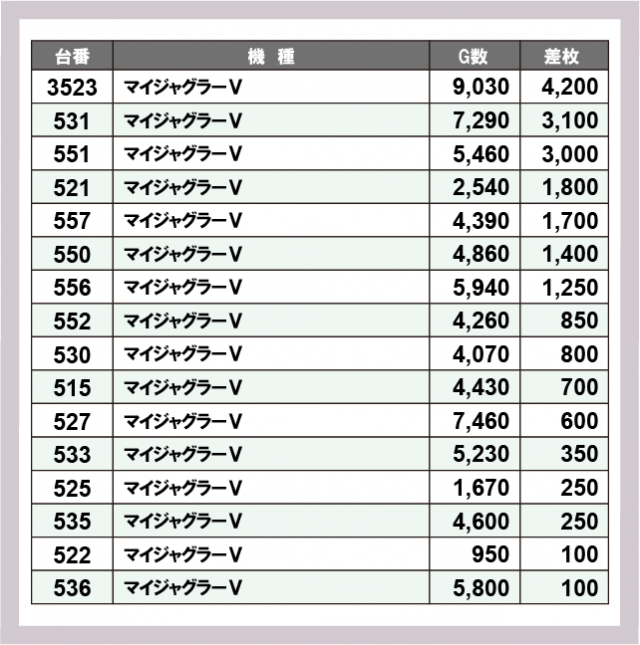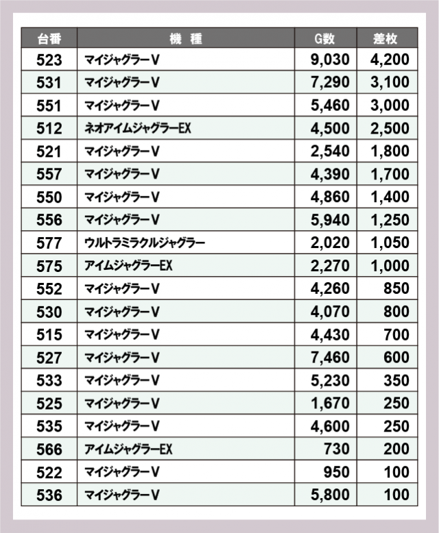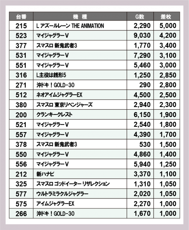 ジャグラー差枚ランキング