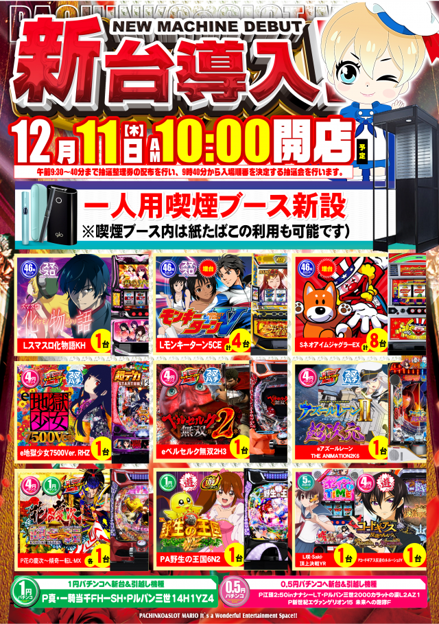 本日店休日明日11日【新台入替】10時開店!抽選入場です!