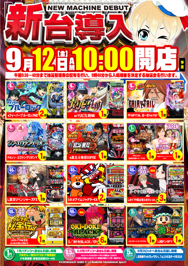 本日12日🌈新台入替10時開店🌈抽選開始時間は9時40分!