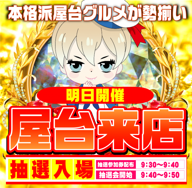 明日駐車場にて🎰屋台来店🎰【抽選集合時間】9:30~40迄