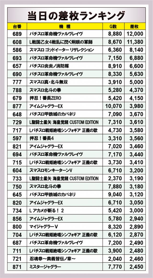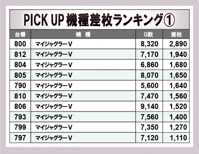 ピックアップされた機種はいずれもプラス差枚数を達成している台が多く、遊技していたファンの笑顔が想像に容易い。そのなかで『アイムジャグラーEX』が8台の2,000枚OVERと凄まじい盛り上がりを披露しており、明らかな手応えを感じていたはずだ。