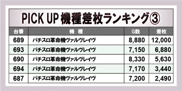 人気機種を中心に名を連ねているのが印象的だが、そのなかで『パチスロ 革命機ヴァルヴレイヴ』『L戦国乙女4戦乱に閃く炯眼の軍師』が万枚OVERと活躍。これに続いて新台『スマスロ ゴッドイーター リザレクション』が8,000枚OVERという熱量を披露し、ほかの機種もまとまった出玉を確保していたのが鮮烈だ。