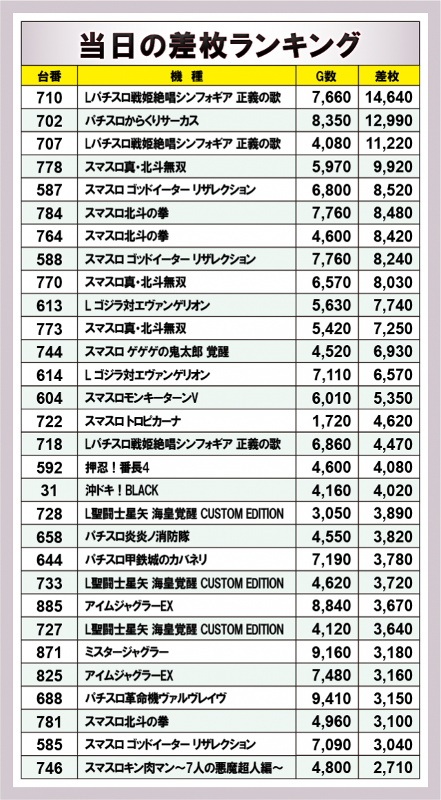 『Lパチスロ戦姫絶唱シンフォギア 正義の歌』『パチスロからくりサーカス』から計3台の万枚OVERが飛び出しており、ほかにも+5,000枚OVERを達成した台が多数存在している。もっと言えば、上表に取り上げた機種は+2,000枚OVERからとなっているため、同店がこの日のためにしっかりと準備を進めてきたのがハッキリと窺えるばかりだ。