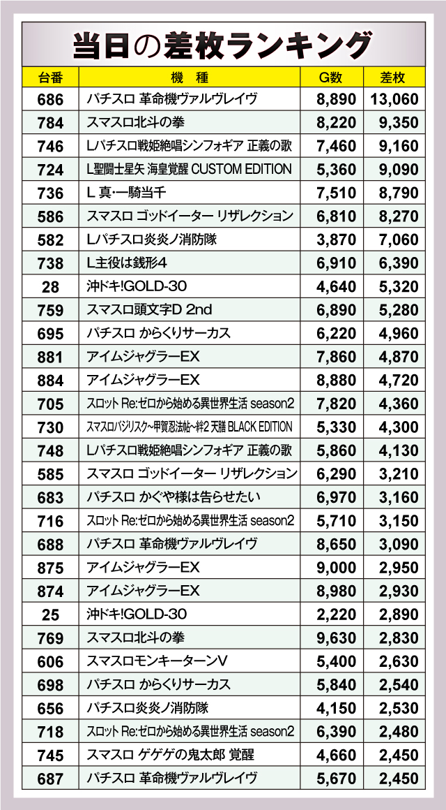 トップを獲得したのは『パチスロ 革命機ヴァルヴレイヴ』。686番台が+13,060枚と驚愕の差枚を叩きだしている。次点は『スマスロ北斗の拳』、『Lパチスロ戦姫絶唱シンフォギア 正義の歌』、『L聖闘士星矢 海皇覚醒 CUSTOM EDITION』。それぞれ+9,350枚、+9,160枚、+9,090枚と惜しくも大台突破ならずの結果となった。