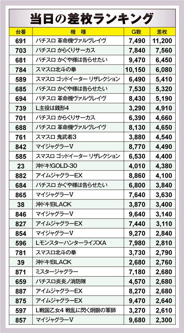 ※差枚数順に掲載しています。