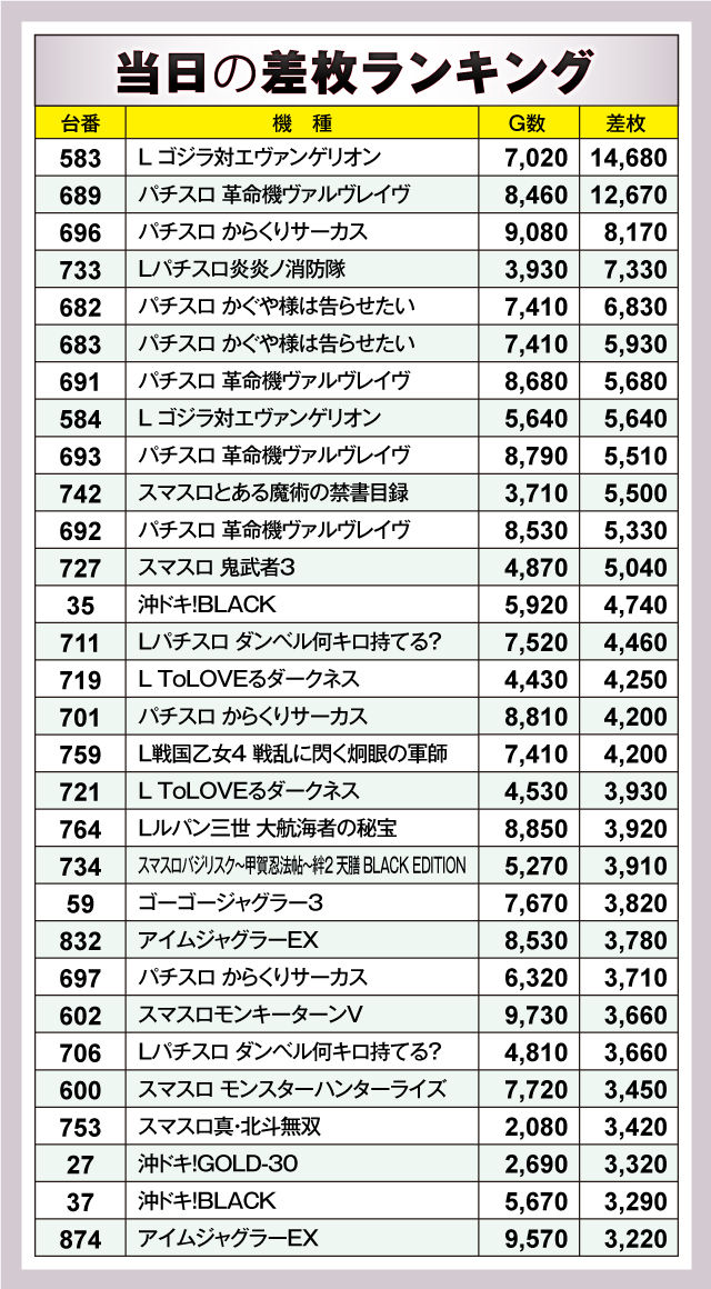 なんと今回は2台が大台突破を果たした。『L ゴジラ対エヴァンゲリオン』583番台が+14,680枚、『パチスロ 革命機ヴァルヴレイヴ』689番台が+12,670枚と、新年としてこれ以上ないスタートダッシュだったといえるだろう。