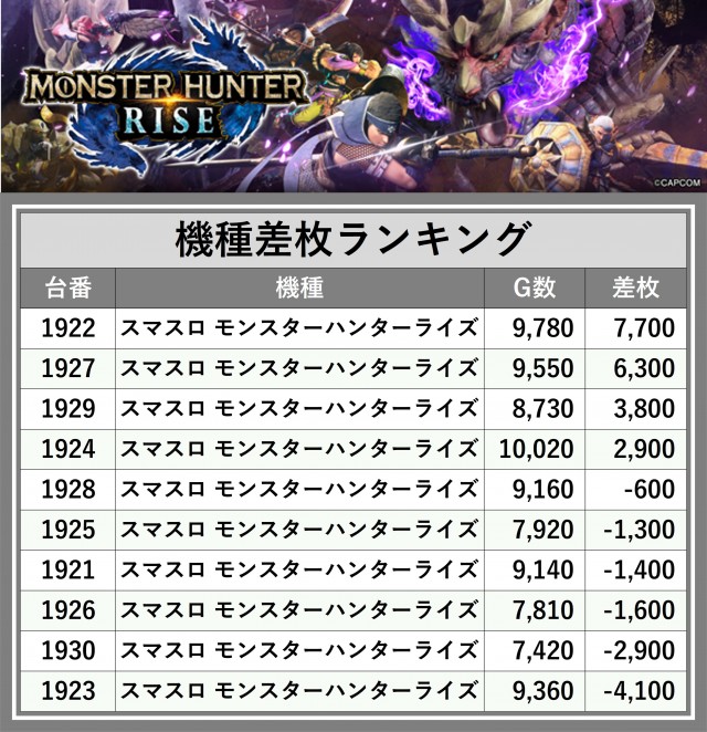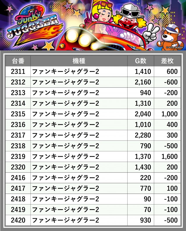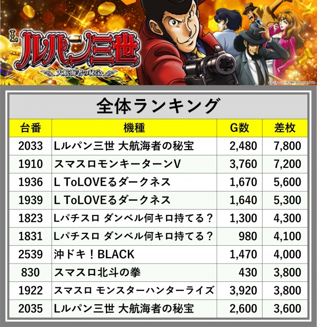 厳選された取材対象機種をはじめ、その他スロット全体から好記録が飛び出した!プレイヤーが楽しんだ1日を下記データにて振り返ってみて欲しい。