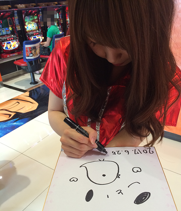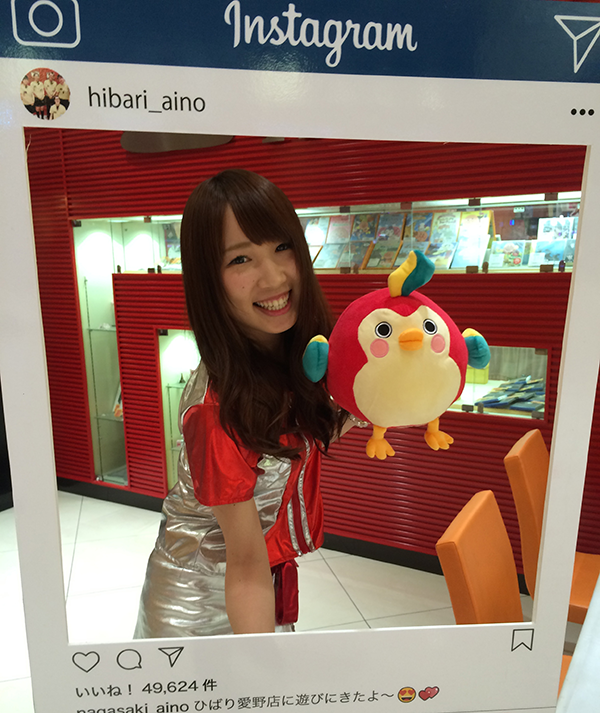 ホールに用意されている写真用のフレームに大はしゃぎ! 公式キャラクターのひばりんごも手放せませんね♥