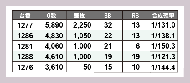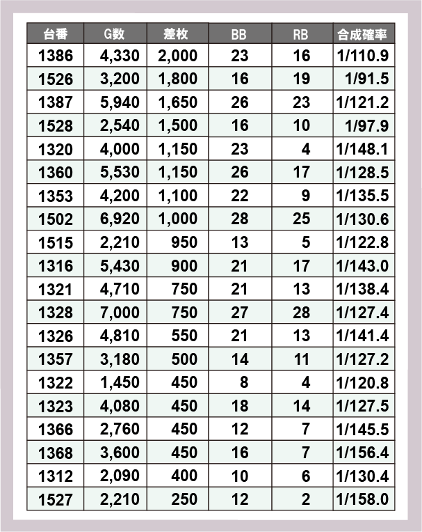 ※差枚数順に掲載しています