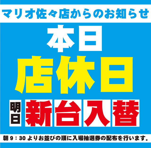 本日、店休日☆明日10時開店☆新台入替