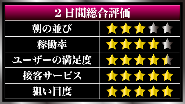 午後以降の状況をみてみると、20円パチスロではミリオンゴッドシリーズと「バジリスク〜甲賀忍法帖〜絆」が大盛況となっており、機種の魅力を引き出しているプレイヤーが多数。満足度が際立つ状況となっていた。