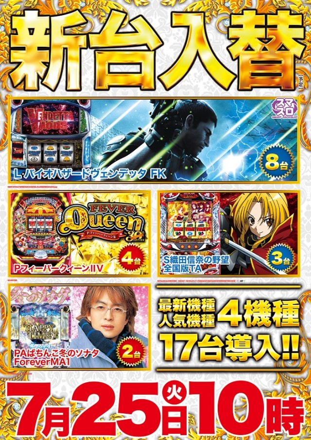【マルハン大安寺店】7月25日(火)新台入替(予定)!!
