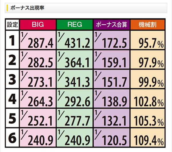 設定差が大きいREG確率に注目。BIGをあわせたボーナス合算確率も参考にしつつ、設定推測を進めよう。