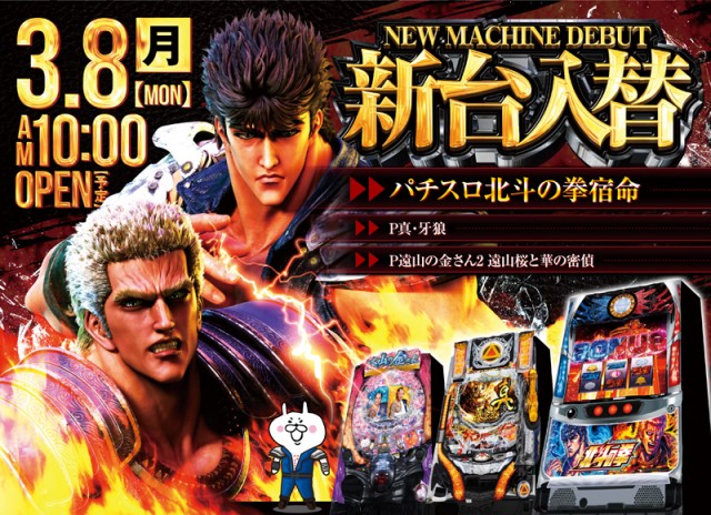 3月8日(月)新台入替!!パチスロ北斗の拳宿命 他導入!!