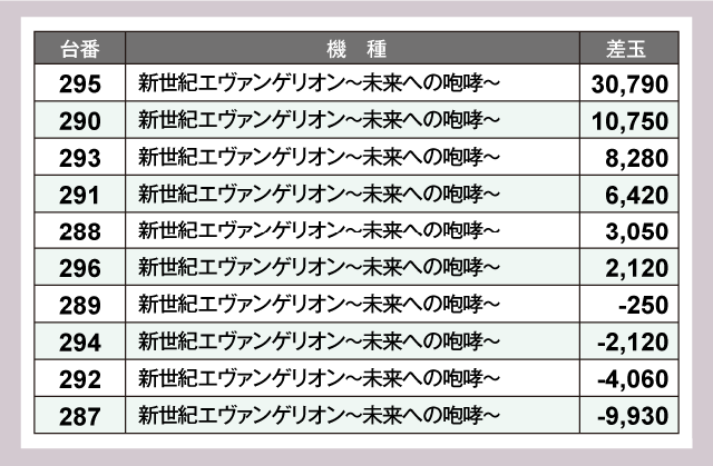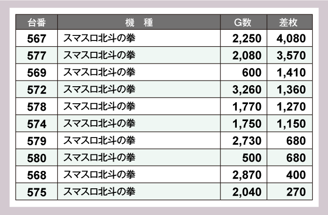 パチスロで好調だったのは『スマスロ北斗の拳』。567番台と577番台が+3,500枚以上の記録を叩き出している。
