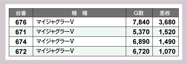 パチスロで注目となったのが『マイジャグラーⅤ』で+1,000枚超の台を多数確認、出玉ナンバー1になった676番台は+3,680枚を叩き出している。