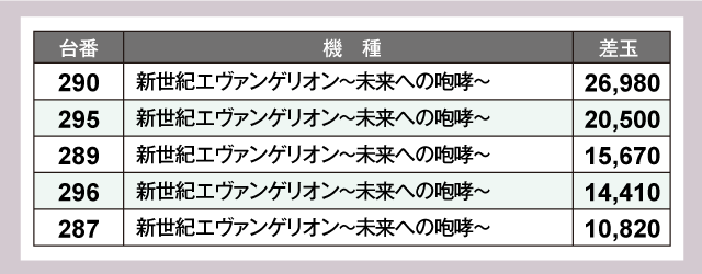 また、パチンコでは『新世紀エヴァンゲリオン〜未来への咆哮〜』に好調台が多く万発超が続出。特に290番台、295番台の2台は+20,000発超を達成する盛り上がりを見せていた。