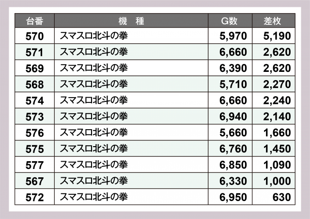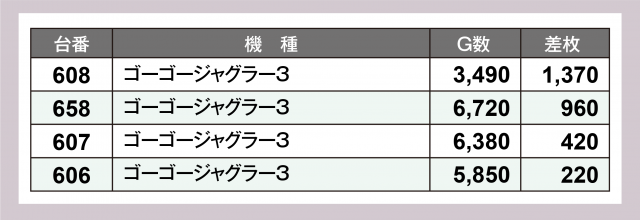 パチスロコーナーの最注目は『スマスロ北斗の拳』。設置11台全てが勝利を果たし、うち11台が4桁プラス。シマ一番は+5,200枚近くとなった。さらに『スマスロモンキーターンⅤ』『ゴーゴージャグラー3』も奮戦が窺えた。