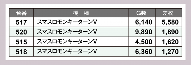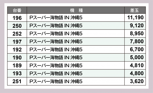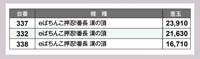 一方、パチンココーナーでは『eぱちんこ押忍!番長 漢の頂』に+20,000発オーバーが2台、『Pスーパー海物語 IN 沖縄5』はプラス台割合の高さが見て取れた。