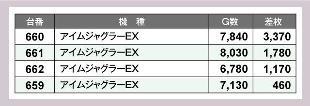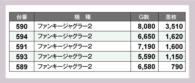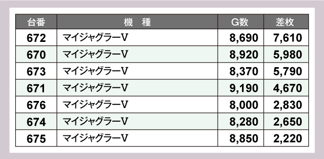 パチスロコーナーで特に盛り上がりを見せていたのが『マイジャグラーⅤ』で、+7,610枚に+5,000枚超が2台とハイスコアを連発。しかも、設置されている7台全てがプラス差枚となる見事な結果を残しているだけに、ファンにとっては大満足だったに違いないだろう。
