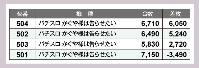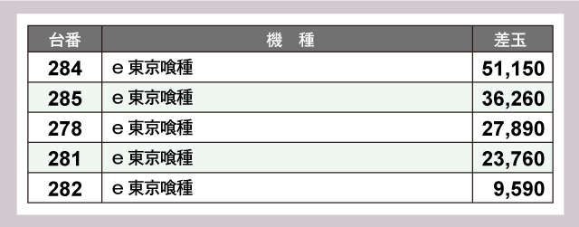 一方、パチンココーナーでは『e 東京喰種』から怒涛の+51,150発が飛び出している上に、+36,260発に+20,000発超が2台も発生。さらに、半数の台がプラス差玉で実戦を終えており、シマ内は終日ファンの笑顔と活気に溢れ返っていた。
