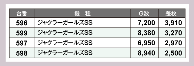 今回、最も目立っていたのが『ジャグラーガールズSS』で、+3,000枚超が2台に+2,000枚が2台と、設置されている4台全てがプラス差枚で実戦を終える見事な結果を残している。ゲーム数も軒並み多く、しっかりと粘ればその性能をきっちりと引き出せる安定感を遺憾なく発揮しファンを喜ばせていた。