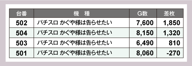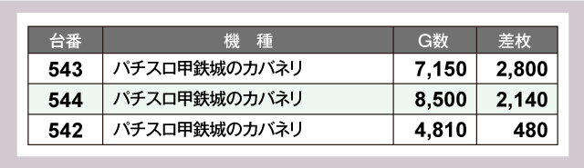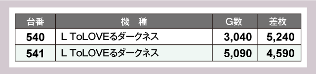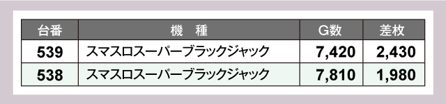 また、その他の機種からも多数の好調台が確認されており、なかでも『L ToLOVEるダークネス』は+4,590枚に+5,240枚といったハイスコアを連発。さらに、『パチスロ甲鉄城のカバネリ』と『スマスロスーパーブラックジャック』は全台がプラス差枚となっている。