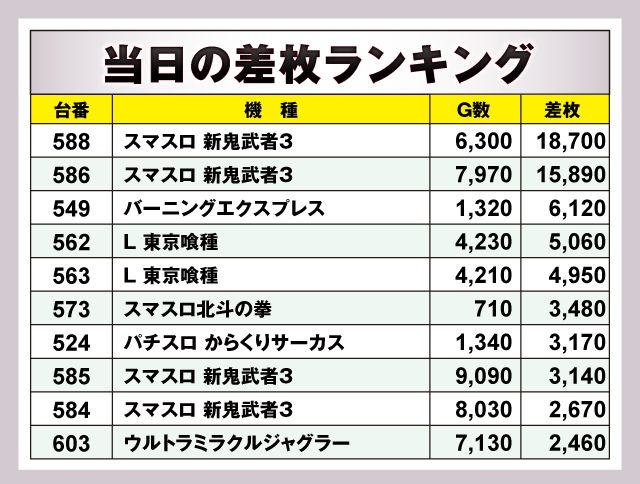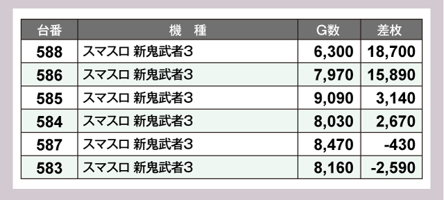 素晴らしい結果を残したのは『スマスロ 新鬼武者3』で、2台が万枚オーバーを達成!そのほかにも幅広い機種から好調台が登場した。