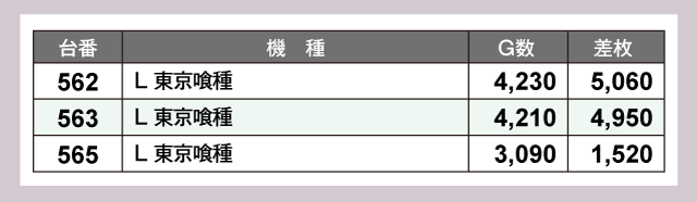 『スマスロ 新鬼武者3』は前述2台の以外にも全台が終日高稼働をマークし、6台中4台でプレイヤーが勝利。『ネオアイムジャグラーEX』『L 東京喰種』でも全台プレイヤーが勝利という優秀な結果を残している。