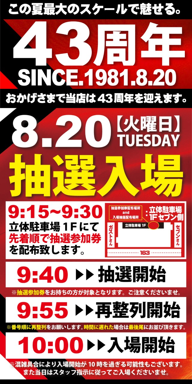 8.20!おかげさまで43周年突破!&新台入替!抽選入場!
