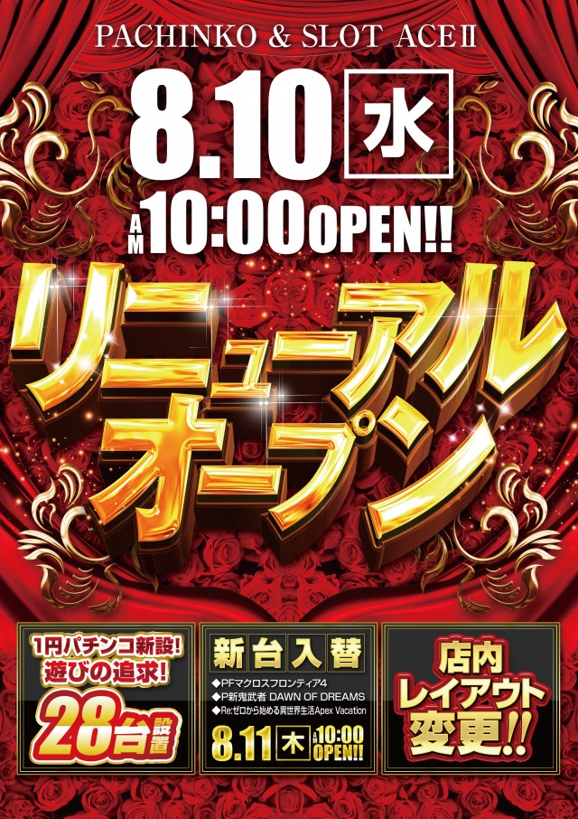 明日8.11(木)新装開店!先着入場!朝10時オープン!!