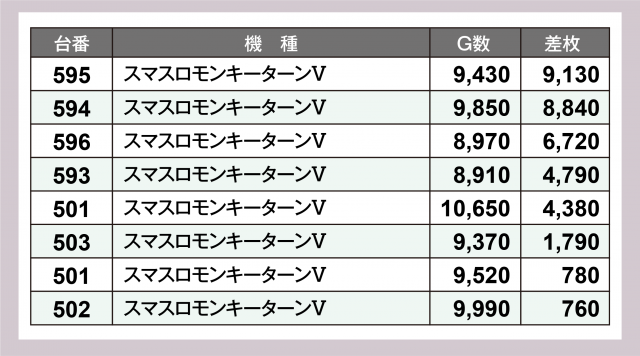21.74円パチスロの注目は『スマスロモンキーターンⅤ』。8台全てが勝利を収め、シマトップの595番台は+9,000オーバーをマーク。