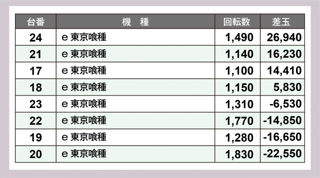4円パチンコでは『e 東京喰種』が勝率高め。その最高値は+27,000発弱の差玉を残した。