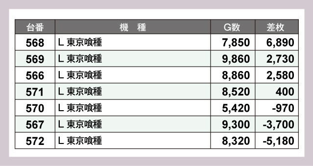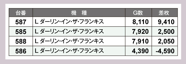 『ジャグラー』シリーズの中から今回は『ファンキージャグラー2』をピックアップ。全台が高稼働で、2,000枚・3,000枚超えが複数あらわれ、店内の熱気を牽引していた。人気の『L 東京喰種』も7台すべてがたくさんのG数を回されていて、プレイヤーたちを満足させていた。導入したての『L ダーリン・イン・ザ・フランキス』からは+9,410枚が飛びだし、そのポテンシャルを痛烈にアピールしている。