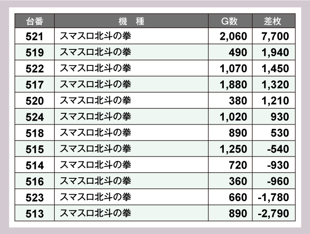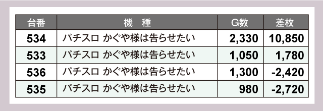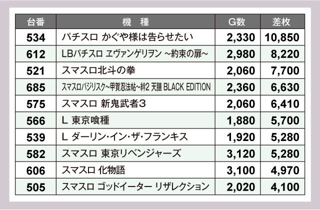 そんな中、特に目立っていたのが『パチスロ かぐや様は告らせたい』で、534番台が万枚超の+10,850枚を叩き出しランキングトップに輝いている。次いで『LBパチスロ ヱヴァンゲリヲン ~約束の扉~』から+8,220枚、『スマスロ北斗の拳』から+7,700枚といったハイスコアが飛び出し店内を盛り上げていた。