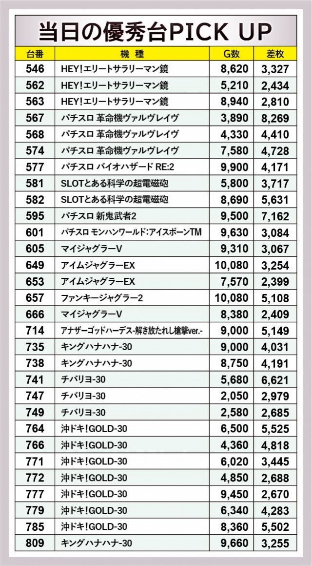 優秀台には人気機種たちがズラリと名を連ねているが、当日は全機種にチャンスが眠っていた様子だった。その中で『パチスロ 革命機ヴァルヴレイヴ』567番台+8,269枚や『パチスロ 新鬼武者2』595番台+7,162枚、『チバリヨ-30』741番台+6,621枚といった大台突破台を確認でき、店内は十分な熱気に包まれていたと言えるだろう。また『アイムジャグラーEX』で万回転OVERが見られ、活気にも満ちていたのが分かるはずだ。