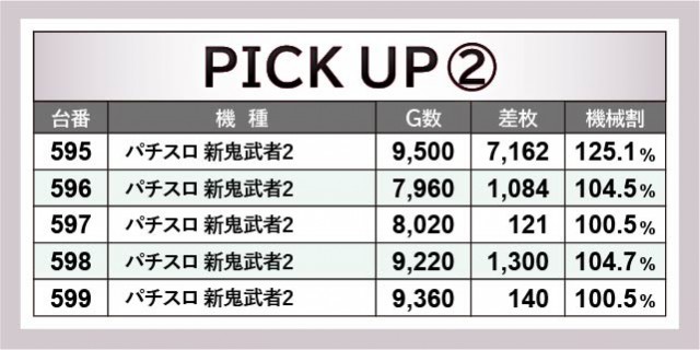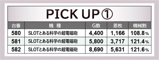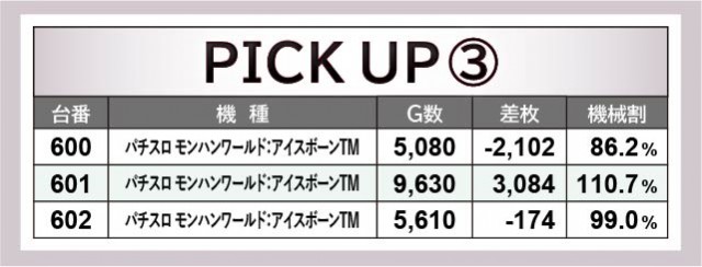 『SLOTとある科学の超電磁砲』『パチスロ 新鬼武者2』は全台プラス差枚を達成し、遊技していたファンは大きな手ごたえを感じていたに違いない。582番台+5,631枚や595番台+7,162枚という記録も生まれており、今後とも注目のエリアになることが予想されるだろう。また『パチスロ モンスターハンターワールド:アイスボーンTM』は負け越しているものの、601番台+3,084枚という十分な熱量が発生しており、こちらでも自信を持ってレバーを叩いていた様子が容易に想像できる。