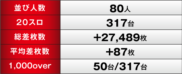 トータル+27,489枚、1,000枚オーバーの台が50/317台と約6台に1台が4ケタ終了と、多くのファンたちを楽しませた1日となった。内容も「ハナハナホウオウ~天翔~-30」などのノーマルタイプや6.5号機にしっかりと楽しめる内容が用意されていたので、まだ遊んだことのない人は、一度足を運んでみてはどうだろうか? 今回で2連勝を達成し、勢いが止まらない同店の動向に今後も注目してほしい!