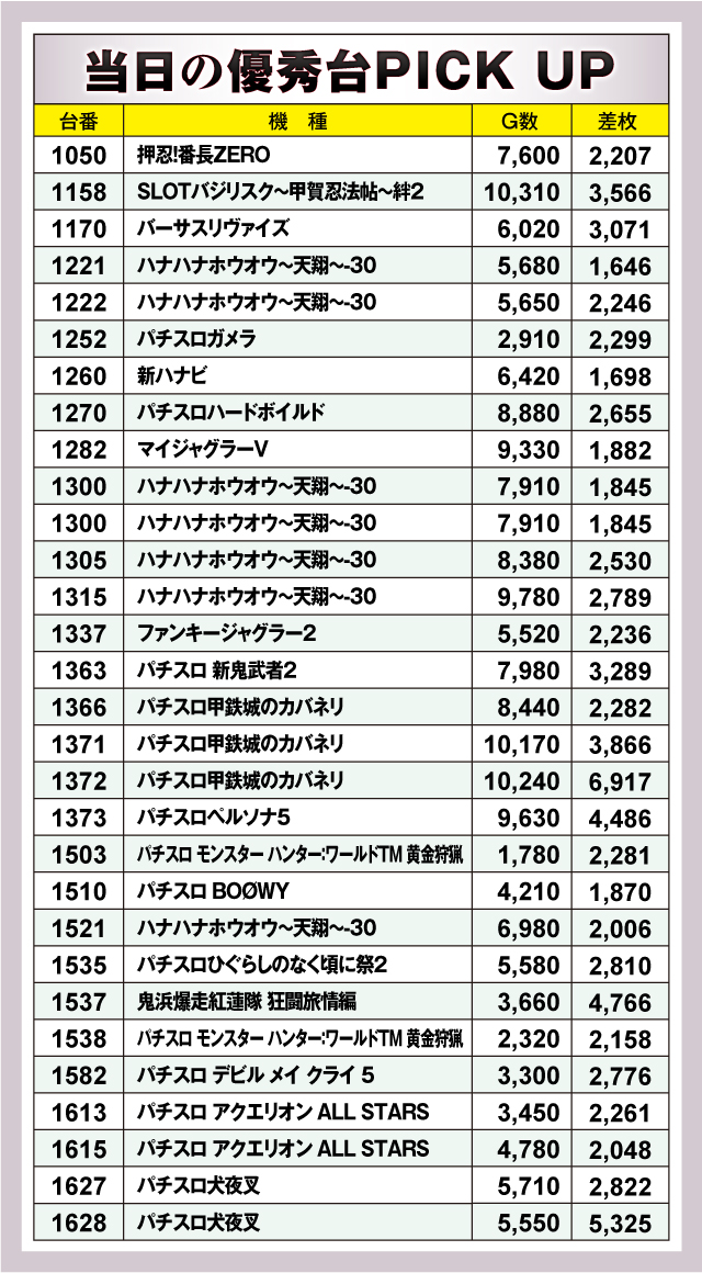 まず初めに当日の優秀台を見ていこう。ノーマル、AT/ARTに関わらず多種多様な機種がランクイン。その中でもっとも高い差枚数を叩き出したのが、番台の「パチスロ甲鉄城のカバネリ」で+6,917枚という素晴らしい結果を残してくれた! その他+3,000枚オーバーの台が約3台に1台あり、多くのファンが満足できる内容があったことが窺えた!