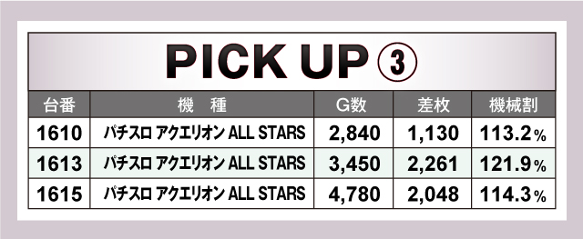 続いてPICK UPした4機種を紹介していこう。「パチスロ甲鉄城のカバネリ」「パチスロ アクエリオン ALL STARS」「パチスロ犬夜叉」の6.5号機3機種から4ケタオーバーのプラスが多数出現。とくに「パチスロ甲鉄城のカバネリ」と「パチスロ犬夜叉」は、5,000枚クラスの差枚数を叩き出していたことからも、今後のスロットの盛り上がりに期待できる内容だった。また、「ハナハナホウオウ~天翔~-30」も素晴らしく、ノーマルタイプらしい安定したプラス台が続出。大いに店内を盛り上げてくれた。