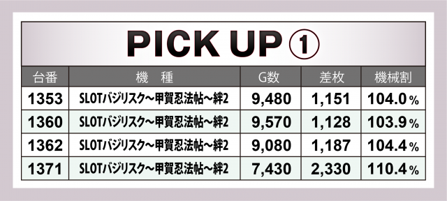 まずは優秀30台のPICK UPから。この日は30台全てが差枚数+2千枚を突破、+3千枚超えは8台、+5千枚以上は3台となった。後述する好調5機種以外では+7千枚近い記録を残した『パチスロ うしおととら 雷槍一閃』の差枚数が光った。