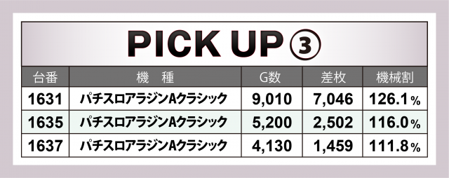 続いてはこの日ハイスコアを残した好調5機種。中でもプラス5台の合計が+1万5千枚オーバーとなった『押忍!番長ZERO』や、その『番長ZERO』をも超える1台平均+3千6百枚の数値を叩き出し&トップの台は+7千枚超だった『パチスロアラジンAクラシック』の成績が際立っていた。