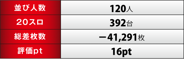 この日の20スロ394台のトータル差枚数はマイナスを喫し、記念すべき初陣をプラスで飾ることは出来なかった。しかし、優秀30台や好調5機種のデータを見る限りではトータルマイナスが信じられないようなプラス枚数を叩き出しており、当日はメリハリの効いた営業が行われていたことが推察される。今後の立ち回りにも活かしたいところで、次回こそは圧倒的な勝利で今回の結果にリベンジを果たしたい!