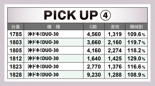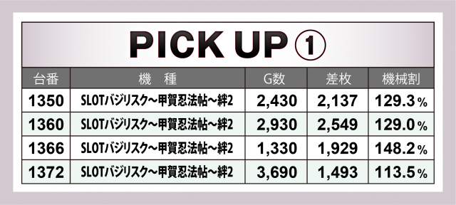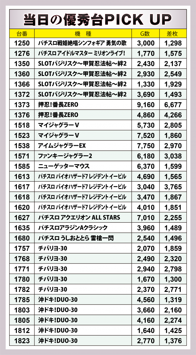 まずは優秀30台のPICK UPから。半数近くの14台が差枚数+2千枚以上を記録。後述する好調4機種以外では、上位5台の合計が+9千枚を超えた『チバリヨ-30』、さらに取材日に導入間もない新台の『ニューゲッターマウス』『パチスロ アクエリオン ALL STARS』が好記録、その他にもドル箱表示の台が多数見受けられた。
