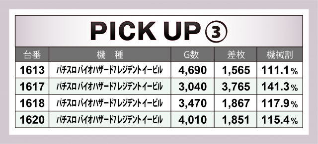 続いては当日ハイスコアを叩き出した4機種。中でも+6千枚台&+4千枚台を輩出し3台合計で+1万2千枚超となった『押忍!番長ZERO』の成績が一際光った。その他、+4千枚弱の台を筆頭に4台トータルで+9千枚弱の『パチスロ バイオハザード7 レジデント イービル』、6台合計で+1万枚に迫った『沖ドキ!DUO-30』も好調だった。