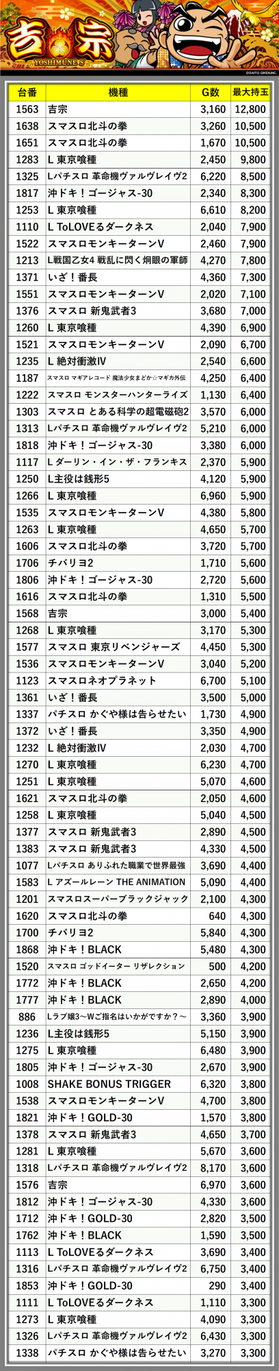 厳選された取材対象機種をはじめ、その他スロット全体から好記録が飛び出した!プレイヤーが楽しんだ1日を下記データにて振り返ってみて欲しい。