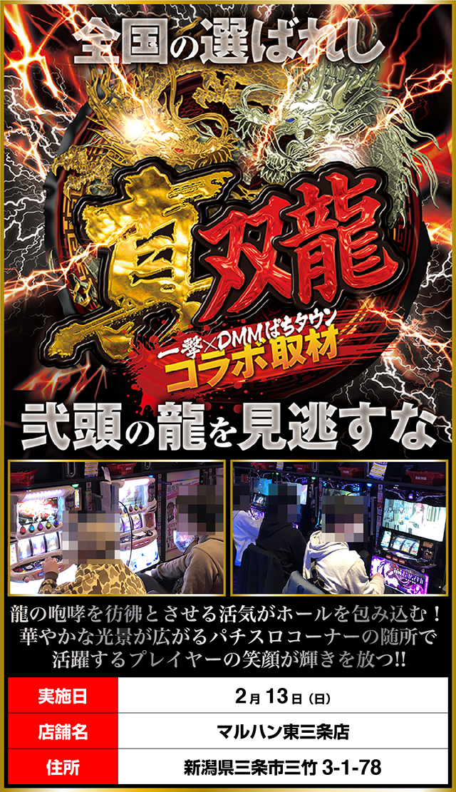 「マルハン東三条店」を舞台に、弐頭の龍の存在を追う「真双龍」を実施。