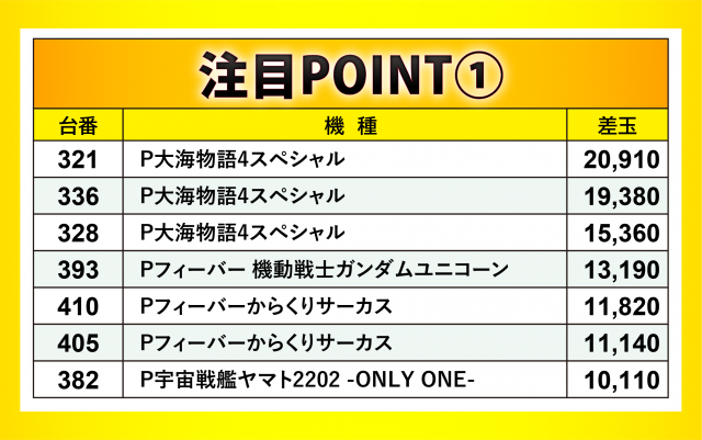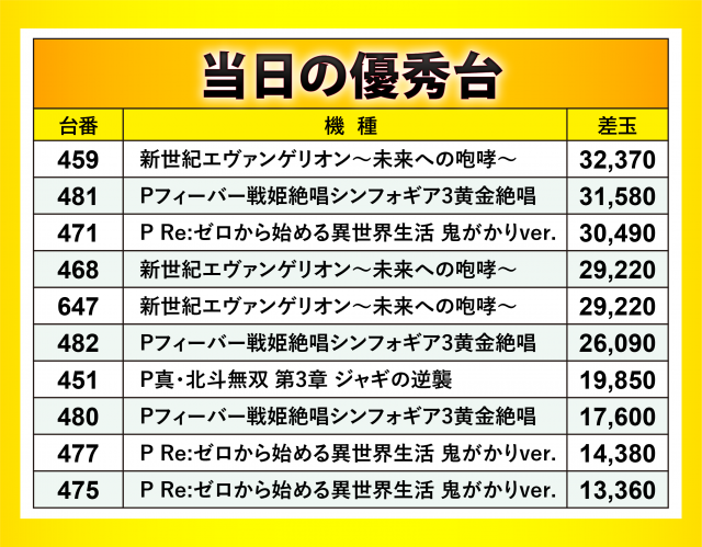 上記機種以外では『P Re:ゼロから始める異世界生活 鬼がかりver.』に+3万発オーバーが1台&+1万発台が2台、『P大海物語4スペシャル』には+2万発周辺が3台! 他機種では+1万発超が5台という結果となった。